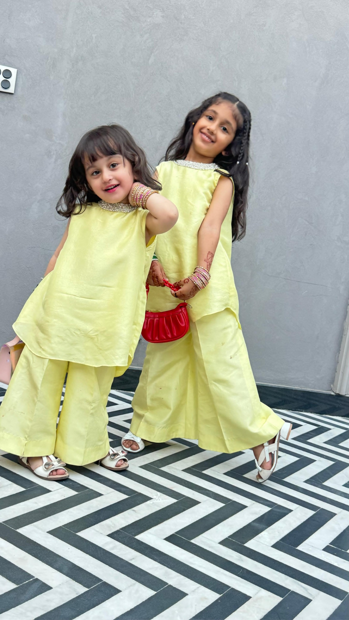 Featuring a soft, lemon-yellow sleeveless pure raw silk shirt paired with elegant wide-leg trousers and a tie and dye silk dupatta. Don't miss out on adding this gorgeous piece to your wardrobe.