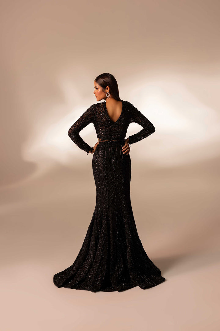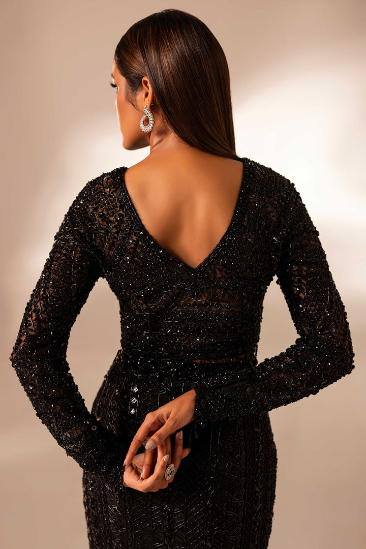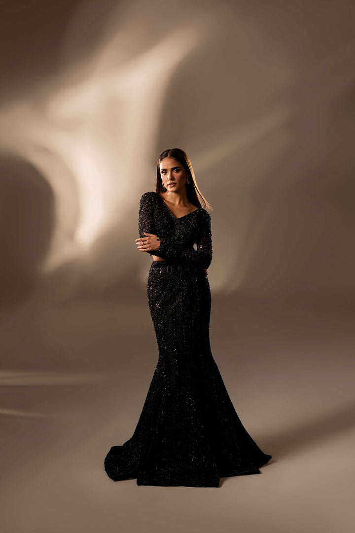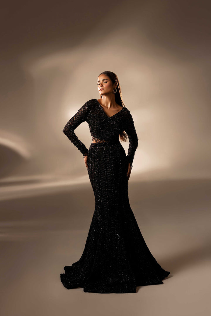 A vision of couture artistry, ethereal mesmerizing black skirt, hand-embellished with Swarovski, pearls, naqshi, sequins, and cut stones, reimagined in dramatic skirt and statement blouse. An eternal ode to elegance and modern glamour.