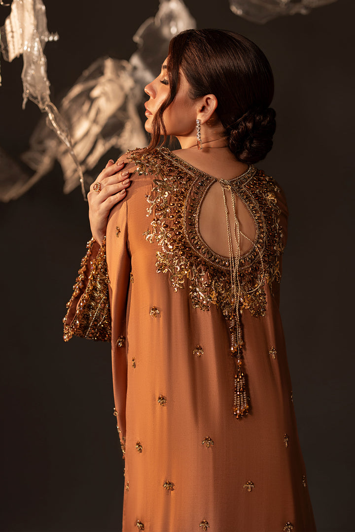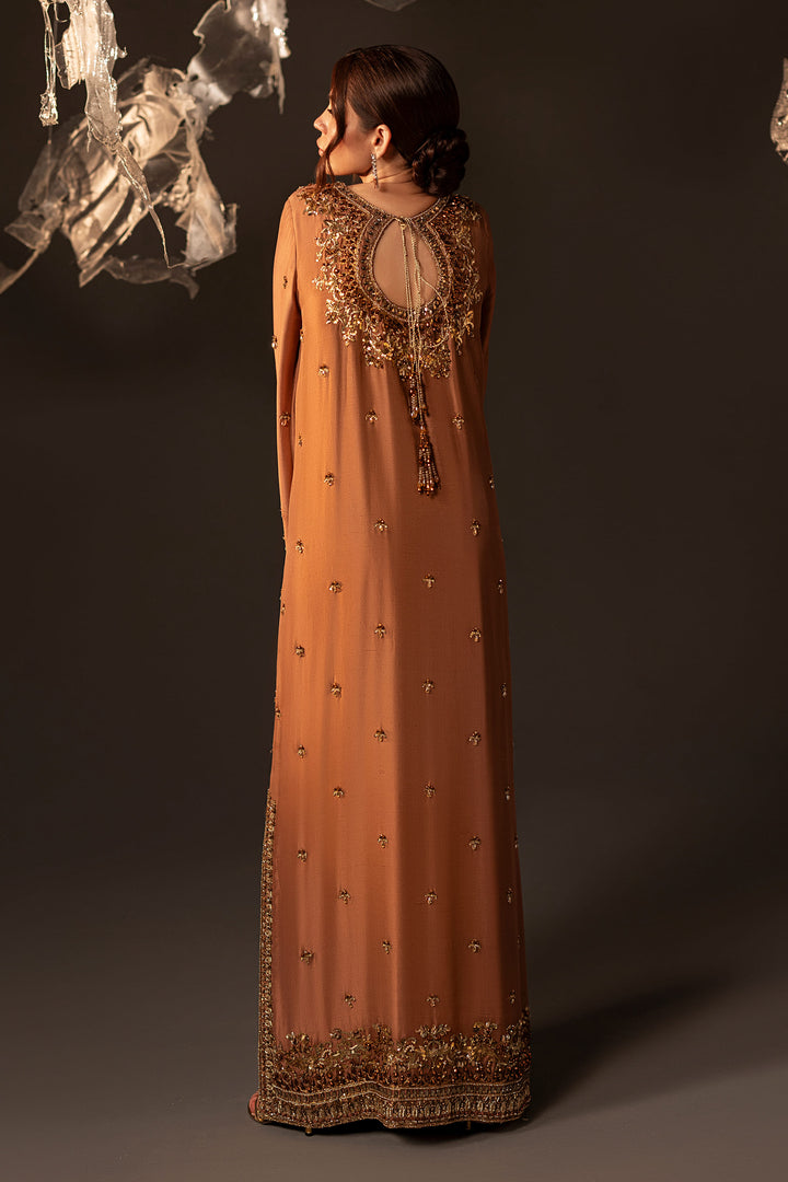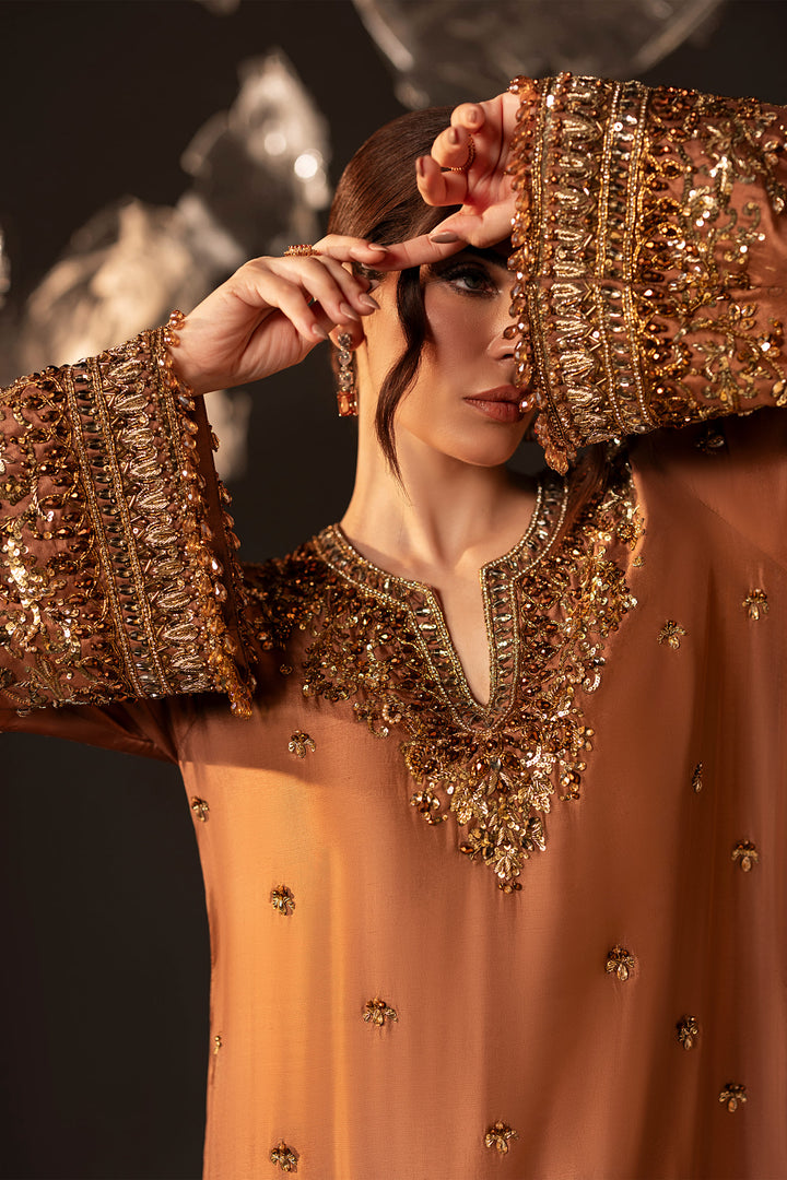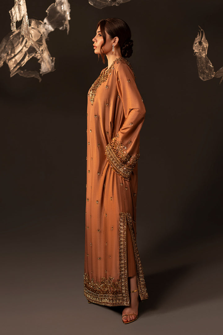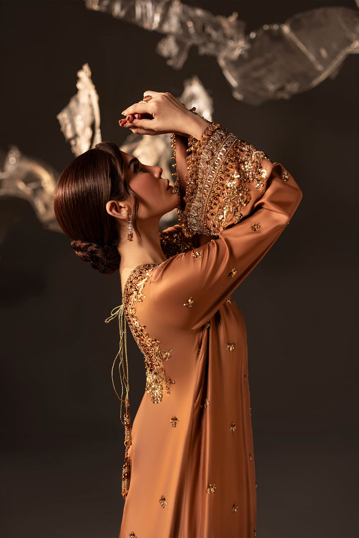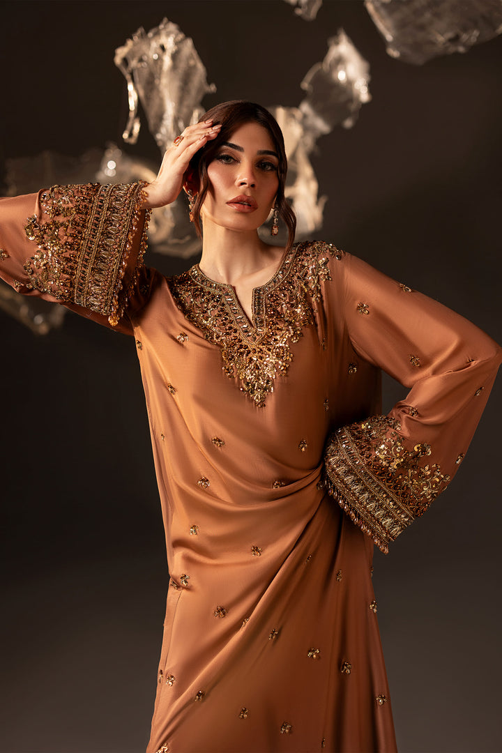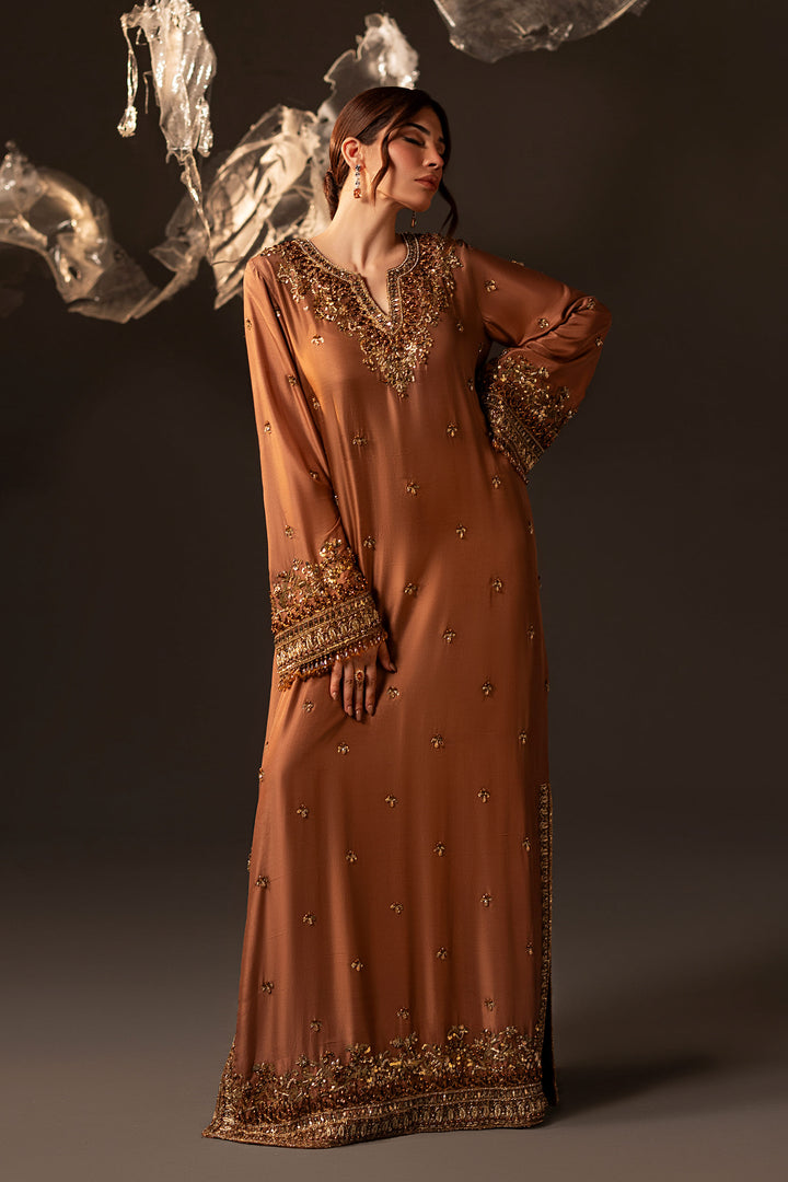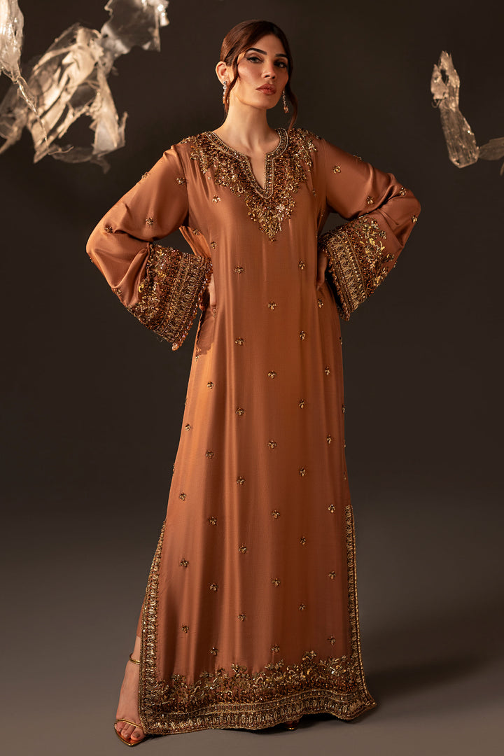 A pure raw silk straight long kaftaan, beautifully hand-embellished with copper and gold accents, sequins, pearls, naqshi, stones, and intricate chain work with delicate pipe detailing, paired with pure silk trouser, this ensemble is an eternal statement of regal artistry.
